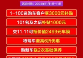 11.11現(xiàn)車搶購購車享受多重權(quán)益廠家集團(tuán)店內(nèi)車展豪禮拿到手軟?? 好車不用等0563-2625618就是現(xiàn)在實現(xiàn)您的購車心愿